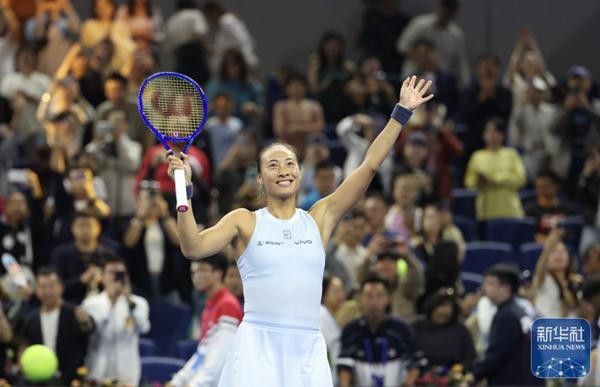 9月27日,在国家网球中心钻石球场,伤愈复出的郑钦文在获胜后开心地与现场观众进行着互动。